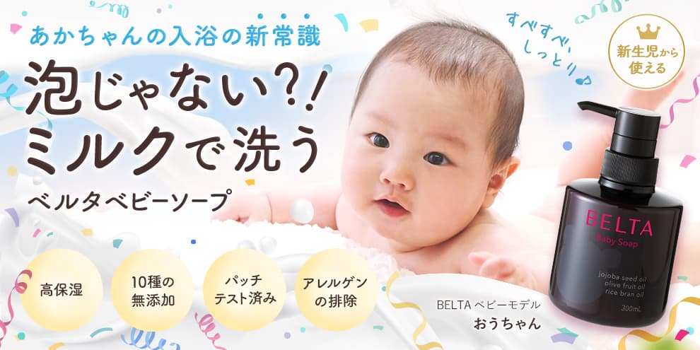 泡ではなく、ミルクで洗うのが「ベルタベビーソープ」の特徴。赤ちゃんのお肌にやさしく、洗いながらに保湿ができるので、沐浴に不慣れな新米ママも安心して使えそうなアイテムです。