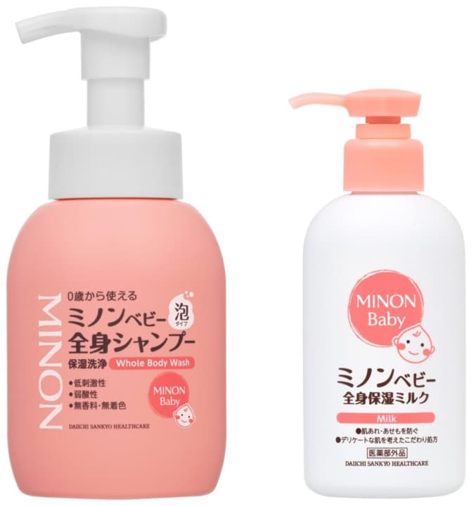 医薬品やスキンケア製品を販売し、家族の健康をサポートする第一三共ヘルスケアからは、赤ちゃんでも使えるスキンケアアイテム「ミノンベビー全身シャンプー」と「ミノンベビー全身保湿ミルク」が抽選で当たるともらえます。