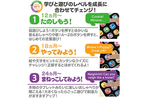 また、お子さまの成長に合わせて3つのレベルを切り替えて遊べるから、長い間使えるのも嬉しい! さらに、楽曲もレベルに合わせた全6曲を収録しているので、よりお子さんのレベルに合わせた英語教育ができちゃいますね。