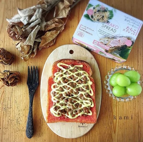 『たらこスプレッド』こちらをたっぷりと塗って、今日のブランチはタラコ納豆マヨトースト🍞😉🌟.