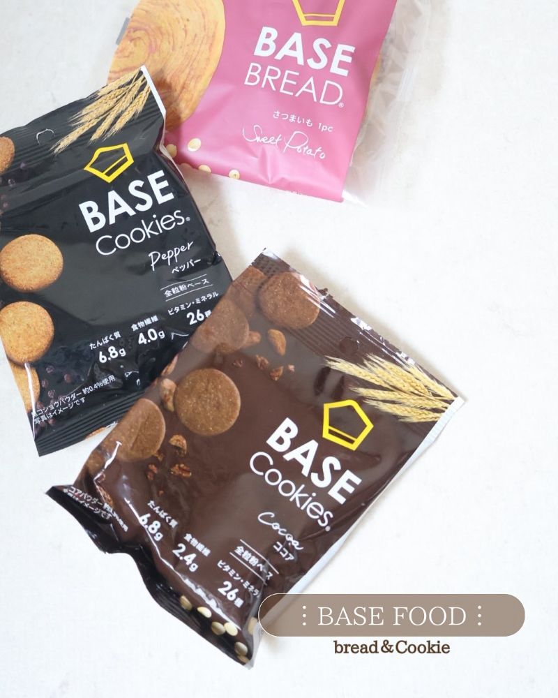 完全栄養食「BASE」シリーズの「BASE BREAD さつまいも」と「BASE Cookies ココア」と「BASE Cookies ペッパー」。