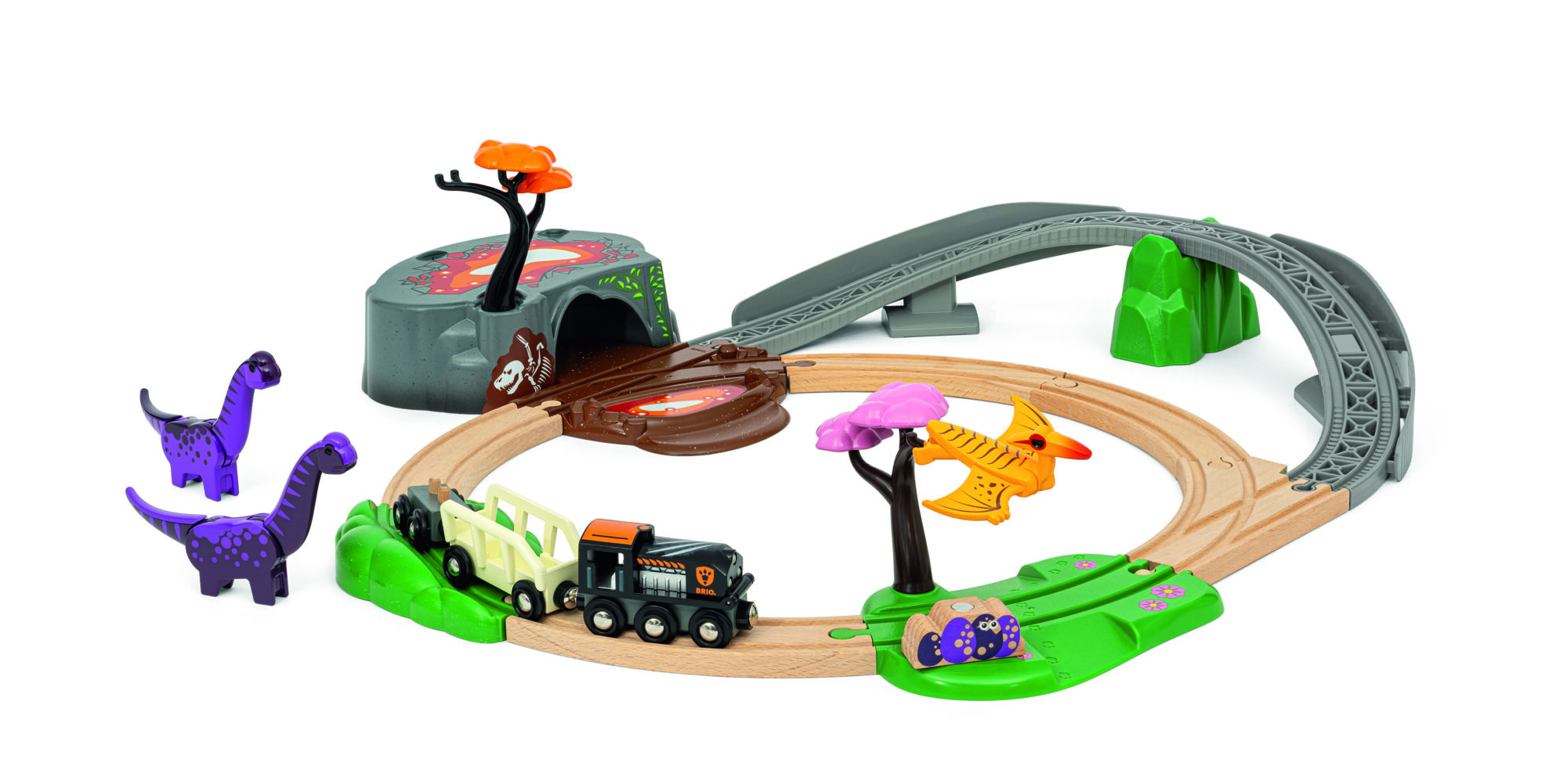 BRIO(ブリオ)のあたたかみのある木製のレールと車両のおもちゃに「恐竜アドベンチャーセット」が登場。恐竜をテーマにした遊びが広がるセットです。