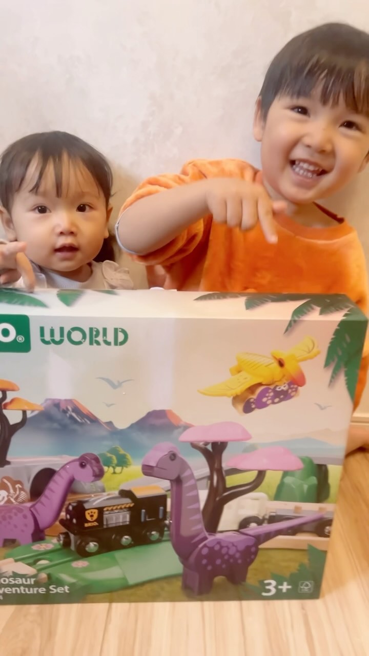 2 台のワゴンを連結できる電車と恐竜3体に加え 早速息子に渡したら大喜び🙌 普段からよくBRIOで遊んでいることもあり 電車の荷台に恐竜を乗せることもできるので 対象年齢が3歳からなので弟は 恐竜自体の首と尻尾のパーツが動くので お誕生日プレゼントにも最適で