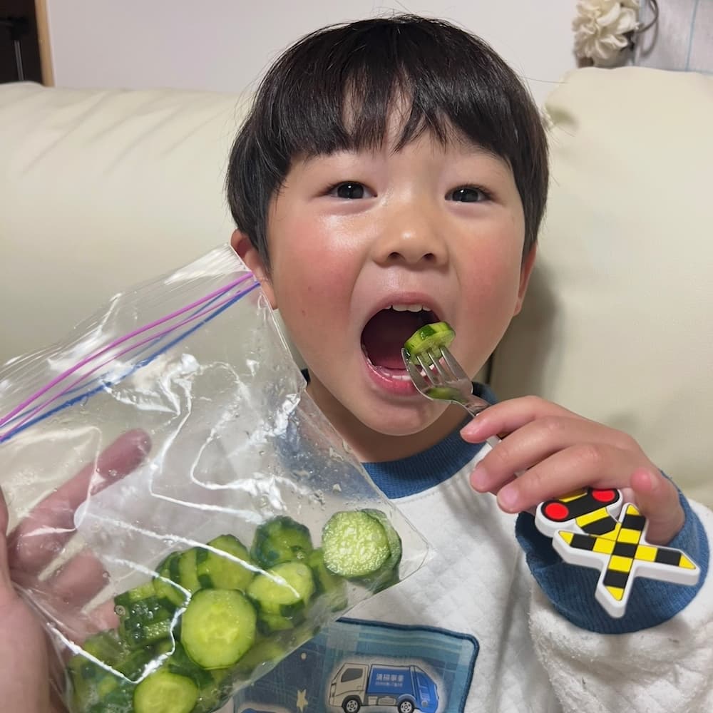最近ようやく少しずつ、野菜が食べられるようになってきた息子👦 (塩の脱水作用で)シャカシャカすると「水がでてくるんだよー」と教えながら 好きな大きさに切ったきゅうり一本に、塩小さじ1/4入れてシャカシャカするだけ