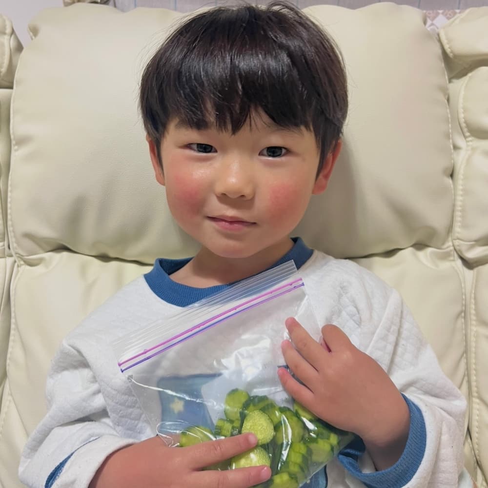 子ども用包丁できゅうりを切って、袋に入れて塩を入れて、あとは「もみもみ〜!」ってシャカシャカ😊