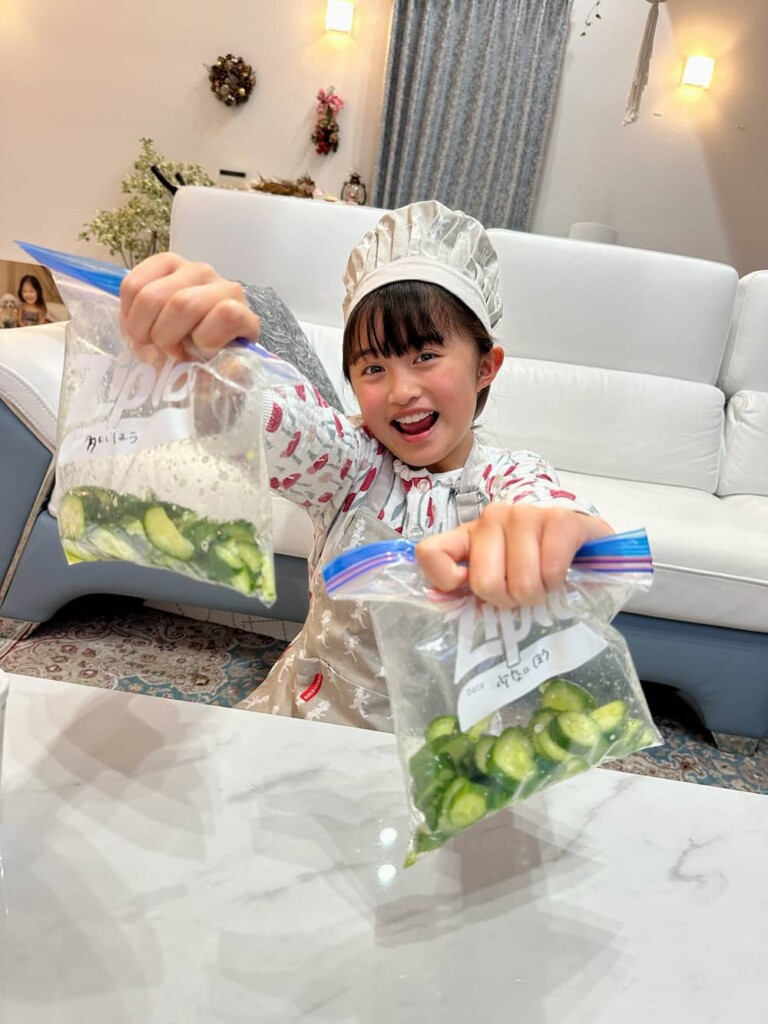 冬休みに“きゅうりと塩だけでつくる浅漬け”を子どもと一緒に作ってみた! 野菜嫌いな娘も自分で作った野菜はおいしく食べてた! 一日おいたものは同じものなのにしょっぱくて、びっくりしてた笑