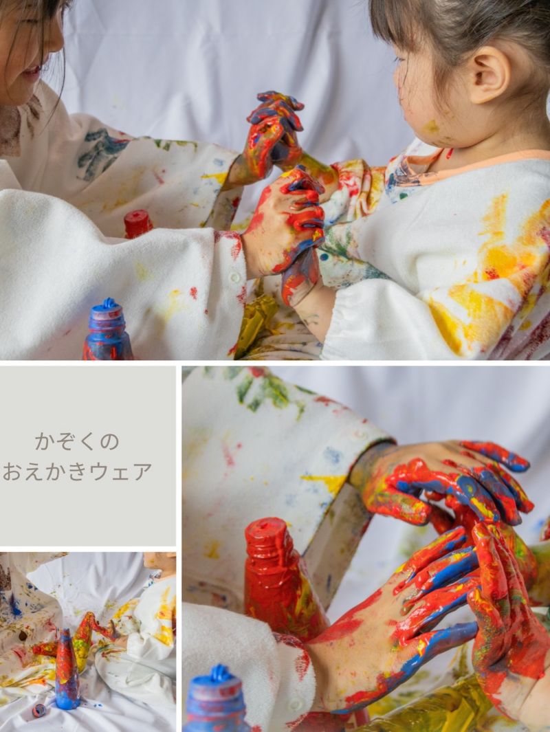 「かぞくのおえかきウェア(おとな用・こども用)」と「ゆびえのぐ3本セット」をおうちでお子さんとモニターしてもらいました!