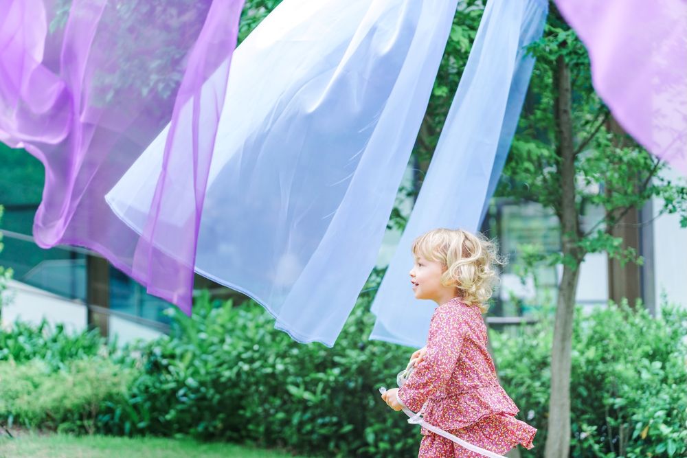 オーガンジーがたなびき、風を感じながら進む巨大な「布の迷路」や、専門家とともに緑をめぐる「緑の散策」、大きな織機で布を織りあげる「まちの手触り」など、自然に触れながら楽しめる体験が満載です。