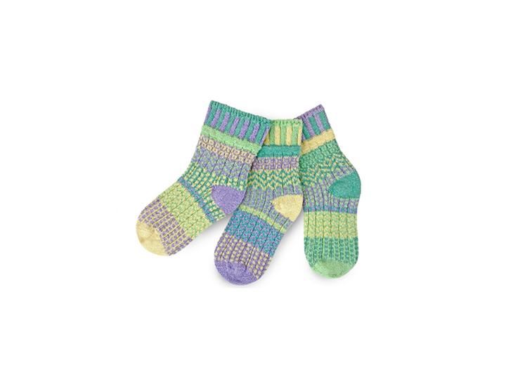 「Solmate Socks(ソルメイトソックス)」は、Tシャツ工場で残った原料や再生コットン糸から作られたくつしたです。テキスタイルアーティストの手から生まれたくつしたは、まるで「履くアート」!